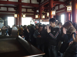 The place was absolutely packed, even though by this time a very cold wind was already building up. Still, there were very few tourists to be seen: on the outside people were just strolling along the shops, and inside people were making donations, praying, having their fortune told, buying good fortune charms, and other staples of Japanese temples. I saw that this temple had a special rack to tie up the Kyô (awful luck) fortune, which may have saved Tomo from Azumanga a headache in that one episode.