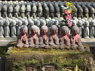 Afterwards, and since it was on the way to the Hase train station (to get back to central Kamakura), I went into Hase-dera, a beautiful, sprawling temple with lots of little gardens, pathways and corners to lose yourself into. It has a tiny cave that you have to crouch to get through, with statues carved out of the walls. It also has a raised observation deck from which you can see the bay. It had a green hill on the edge of the bay; it looked like San Sebastian.