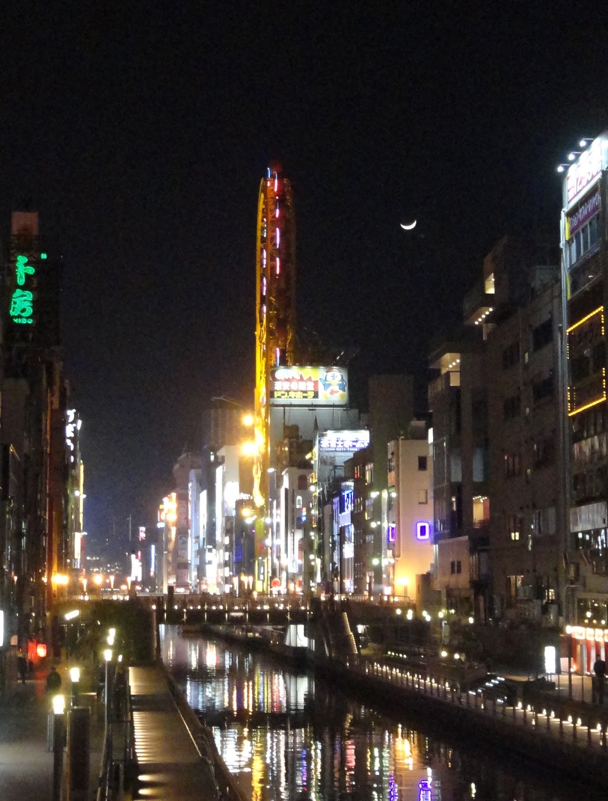 After the visit to the castle, I went back to the centre and walked around Dotonbori a little bit. The guidebook wasn’t wrong when it compared the canal walk with Blade Runner: all the neon signs, the videos, the music and ads playing at top volume (there was a horrifying jingle that kept going “Takoyaki! Takoyaki! Ta-ko-ya-ki~!”, takoyaki being an octopus-based snack typical of Osaka), the hordes of people, some dressed to the nines and some just weirdly, the clash of East and West… This being a Friday night, the shopping streets were absolutely packed (but the canal walk was meanwhile deserted), and this being Japan, all the shops remained open and doing business when I left, at 20:45.