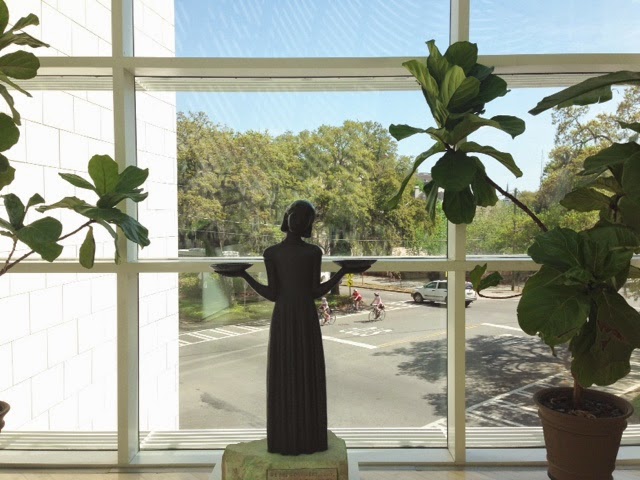We’re going to leave the house tour for tomorrow, but we went into the Jepson (it’s literally on the other side of the street) to see the Bird Girl, the beautiful sculpture that became famous thanks to the cover of Midnight in the Garden of Good and Evil. There’s something preternaturally serene about her, her posture symmetrical but with the head cocked to one side. Photographer Jack Leigh found it in Bonaventure Cemetery after a suggestion from author John Berendt, and it made it into the book and also into Clint Eastwood’s movie. So many people began visiting it in the cemetery that they had to remove it from the family plot it was in and move it to the museum.