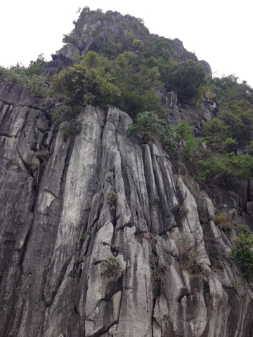 Our main and last activity for the morning was to disembark at a small beach (most formations are just rocks jutting out from the water, so seeing a beach is pretty rare). When the weather’s nice it must be very relaxing to lie down or swim in the water -not that I would do that, even then; saw plastic bags and a jellyfish the size of a sports bag- but as it were we went up some steep steps up the mountain and into a cave. Our guides gave us some disjointed explanations in barely intelligible English. Perhaps they were interesting, I wouldn’t know. They spoke several times about “Sala Thai” and “Sala May” until it hit me that they were saying stalactite and stalagmite. The cave itself wasn’t impressive, but it was good to get on one of the islands. They are deceivingly tall, moreso than they look in the pictures, and are made of sheer rock and trees.