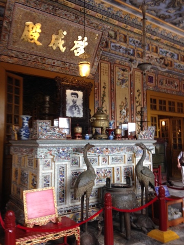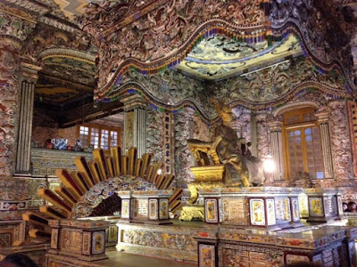It’s like walking into the king’s chamber in Versailles, except looking through an Asian kaleidoscope. The shrine and the actual tomb are in garishly decorated rooms with ceramics, mosaics, tiles, ceiling frescoes, all done in European materials and colours but depicting Vietnamese and Chinese scenes and motifs. Emperor Khai Dinh is known to be really buried here, for once, 18 m below the surface.