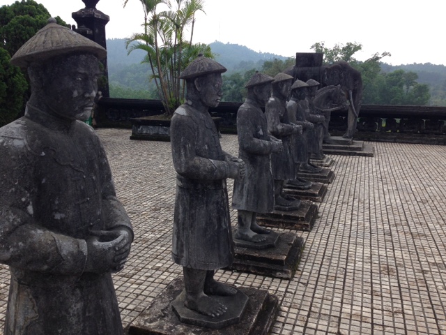 The second tomb we visited was emperor Khai Dinh’s, built in the early 20th century (!). He was the penultimate Vietnamese emperor, at a time when emperors were all but symbolic during the French colonial era, and indeed his tomb is a bizarre mix of Asian and European styles. Unlike the other tombs, instead of sprawling over a vast expanse of land this one is carved into the slope of a mountain (I was told the spots were chosen due to their good feng shui). From the top you can see a statue to the goddess Guan Yin (Kannon, compassion) in the distance.