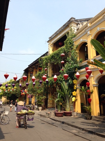 I suspect this town may be less of an early riser than the rest of Vietnam, because I came in at around 9:45 and some shops were still closed (in Hanoi lots of places close at 11:00 for lunch…). It took a while until the streets filled again with tourists. Because the streets are closed to traffic, the only transport here are bikes or cyclos (a rickshaw type of thing). Every once in a while you see a long line of ten or so cyclos carrying one tourist each, individually. Also, as if to fill in the wonderful lack of honking here, when bike and cyclo drivers want to warn people off their way they actually say “beep beep beep”. They literally pronounce the words “beep beep beep”, creating the most bizarre scenes. I saw a lady do that who had an actual bell on her bike handle.