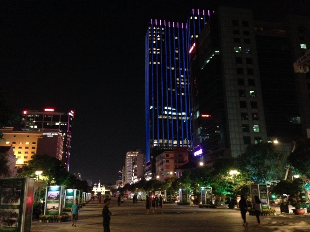 I was done with the visit sooner than I expected -I think some zones were cordoned off due to the summit- so I made my way back to the hotel for a nice air-conditioned rest. I came out again for dinner after dark. After the last two weeks of dark, quiet nights, this felt like Blade Runner: all the lights were on, the avenue was lit on both sides with lamps that changed colours, everybody was out on the street walking or dancing to music or just hanging out… So different, from the rest of Vietnam as well as from Europe or the US! Really a place unto itself!