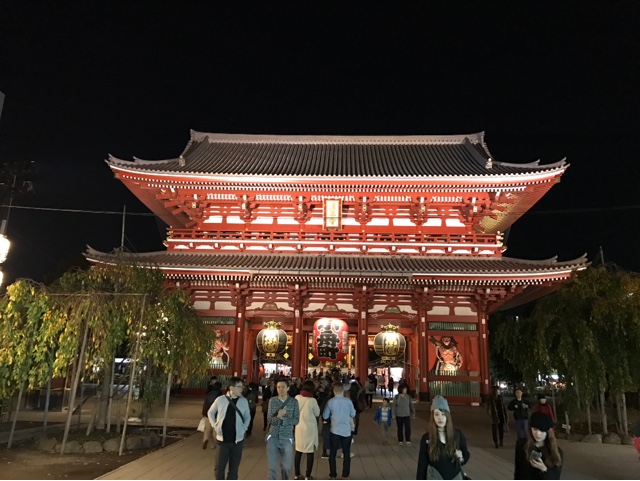 It was already dark outside, so we just went out a couple of subway stops away to Senso-ji, Tokyo’s biggest and oldest Buddhist temple. I succeeded in buying Pasmo cards from a counter at the subway station entirely in Japanese; I kinda preferred the Suica because it has a penguin on it instead of a tram, but it’ll do! (Pasmo and Suica are both Tokyo’s Oyster card, the contactless cards you use to pay your fare in subways and buses. Most of our transportation needs here will be covered by the JR Pass, but sometimes the subway’s the best route.)