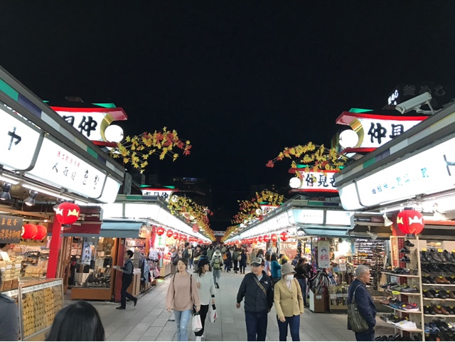 It was already dark outside, so we just went out a couple of subway stops away to Senso-ji, Tokyo’s biggest and oldest Buddhist temple. I succeeded in buying Pasmo cards from a counter at the subway station entirely in Japanese; I kinda preferred the Suica because it has a penguin on it instead of a tram, but it’ll do! (Pasmo and Suica are both Tokyo’s Oyster card, the contactless cards you use to pay your fare in subways and buses. Most of our transportation needs here will be covered by the JR Pass, but sometimes the subway’s the best route.)
