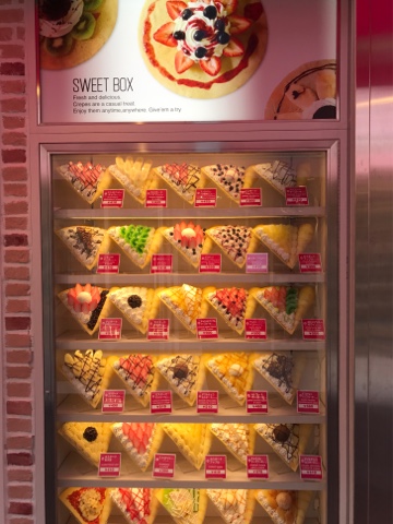 We took the JR line to Harajuku station and began our walk with Takeshita-dori, the crazy loli/goth street where every other store sells platform shoes, ruffled skirts, or crepes. It was as deliciously mad as I remembered it, with many stores playing sickeningly sweet jingles outside. Some of the passersby looked even more garish than the mannequins. Even the food offerings here are sugary and cute, with every corner housing a Japanese creperie. Crepes here are rolled into cones and can contain unexpected amounts of whipped cream and full-sized actual pieces of cake inside. If any arteries remain unclogged, a store also sold rainbow-coloured cotton candy.