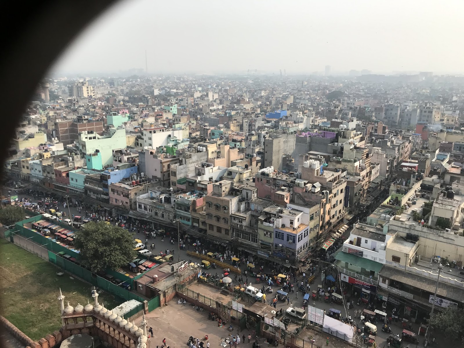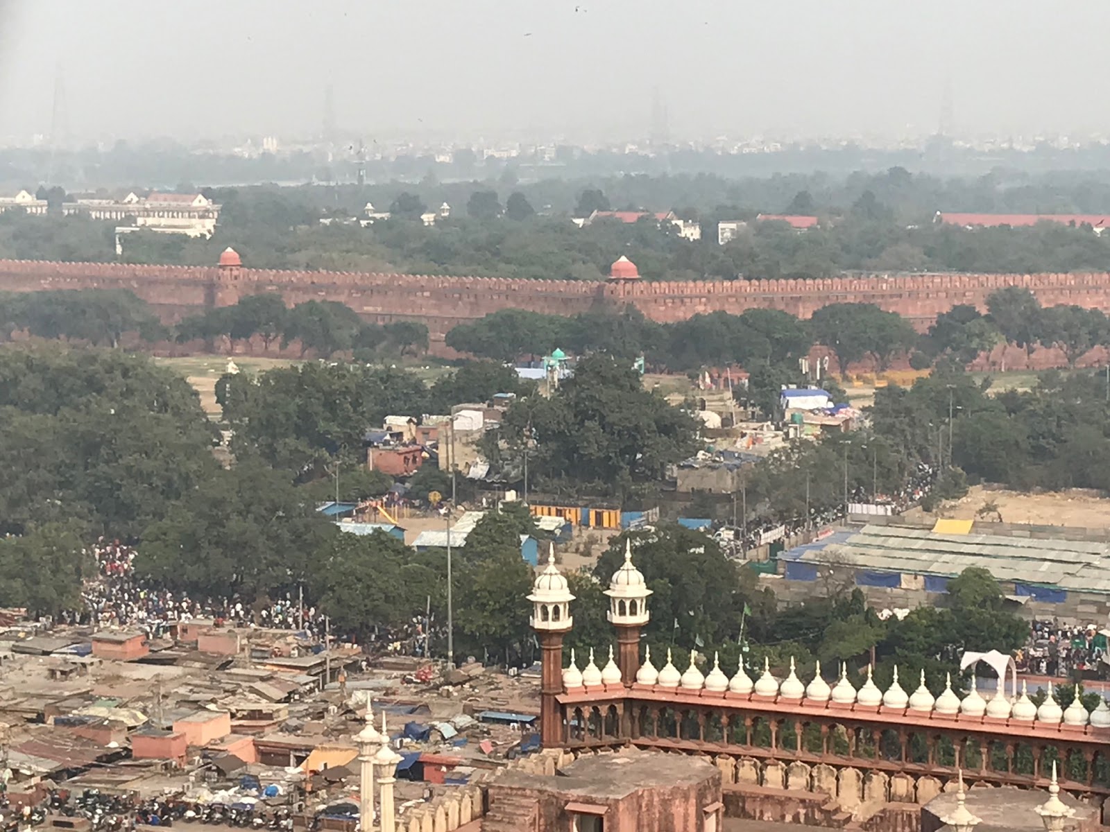 The climb was arduous, because you have to go up on the ramparts first and they’re very pebbly (remember you’re still shoeless), and then it’s a long climb up a very narrow, single spiral staircase. There’s no awnings, so whenever you cross someone going in the opposite direction, it gets very up close and personal! Eventually I made it to the top, and although the top of the minaret is also tiny (little more than a cage up a tower) the view really is spectacular. I always like to see cities from above, it helps put the travel into perspective. I could see the endless sprawl of the city, and also the walls of the Red Fort, which looked even bigger from here than from the inside. Did I really walk up and down that entire length multiple times?!