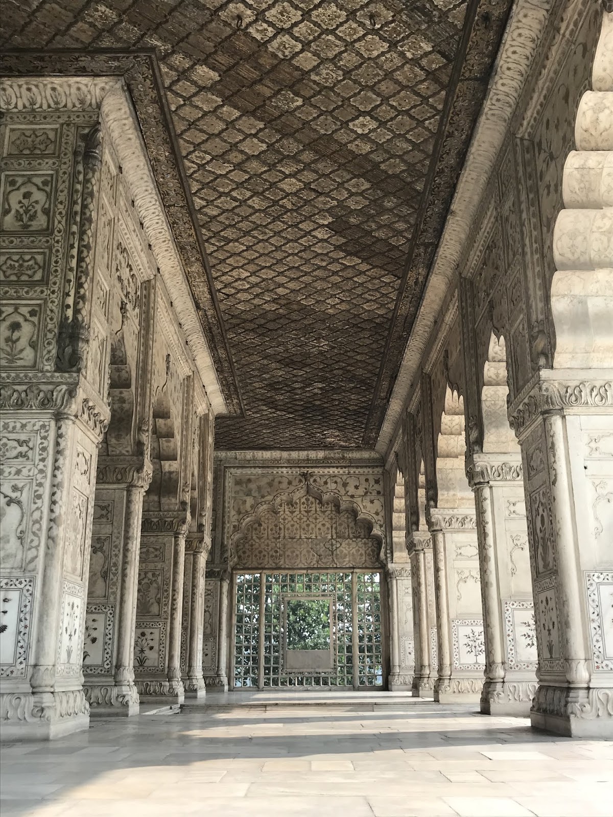 There is no one central building inside the fort, rather a variety of pavilions, residences, baths, a mosque… all peppered across expansive gardens. There’s an elephant gate (so called because at the time visitors would come riding elephants and park them there) right across the entrance, and then a building that forms an archway. After that it’s more freeform as to what to visit. On the Eastern side there’s a series of beautiful, white marble pavilions, which served as residences for the rulers and their families. The inlaid decorations are beautiful, and the successive arches and columns are evocative of a time long past. There’s one canal that connects several of these residences; I learned that running water was used as an air conditioner of sorts, to lower the temperatures in summer. It was a pity that it was dry: imagine the splendor of these gardens with the trickling of water and fountains everywhere!