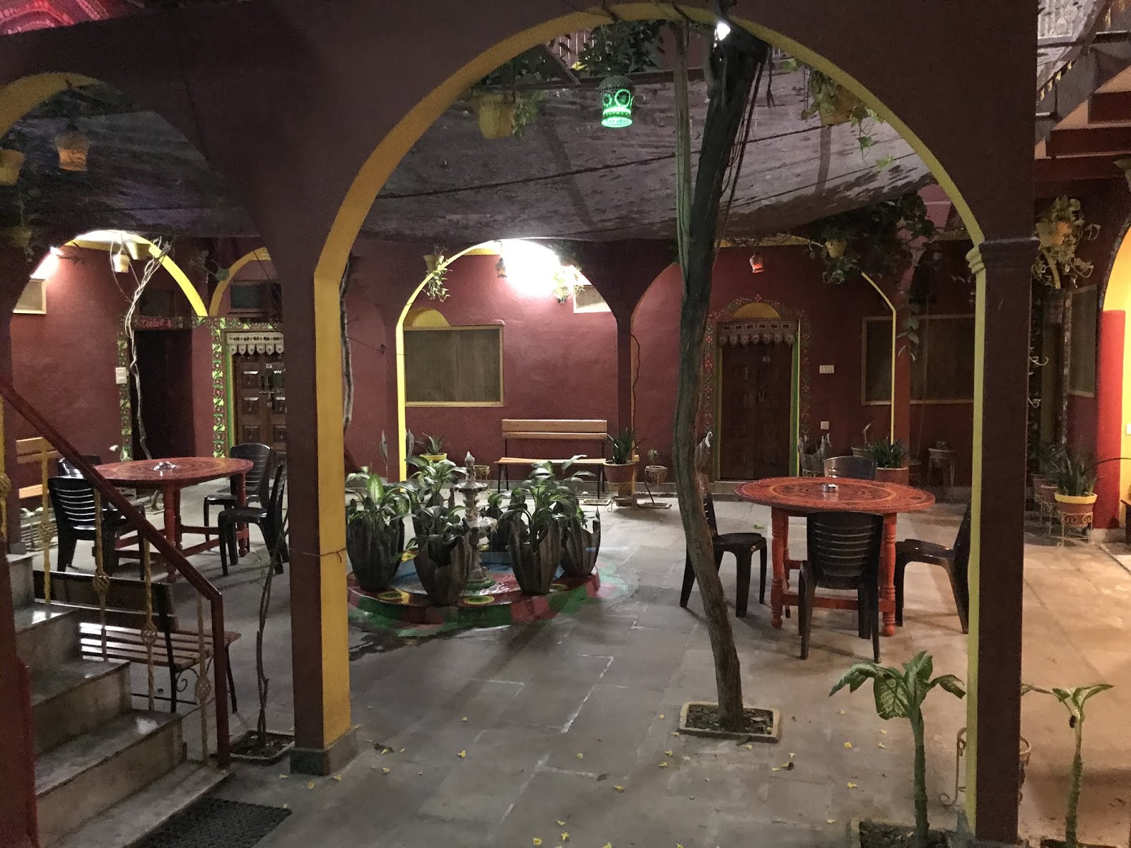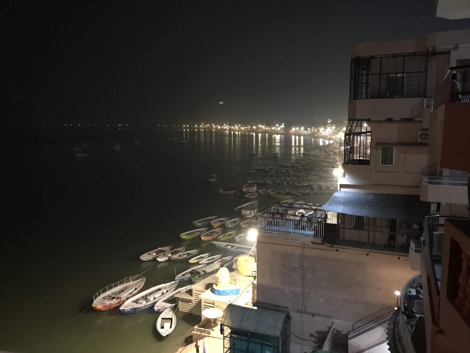 I’m staying at the Ganpati Guest House, which is right *on* the river Ganges. It is more quirky and modest than the other hotels I’ve stayed at (the rooms are locked with a massive padlock) but it’s also charming: all the walls are painted in bright colors, there’s an atrium, and I had dinner at a rooftop restaurant with views over the night-time Ganges river. It was shocking to see it suddenly, in person, so large and wide; one of those sights I kind of didn’t think were real. Sadly, I could see from the haze around the lights that the air really is quite dirty around here.