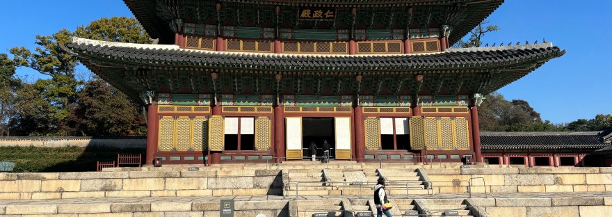 My first stop was Changdeokgung Palace, one of several magnificent palaces in Seoul. I wanted to start with this one because it is home to the Secret Garden, so-called because only the royal family and their favorites used to be able to visit. Now it’s the Secret Garden because only a limited amount of people can visit on any given day, as part of a guided tour, the tickets only go on sale the week before, and they sell out in minutes. I’d been unable to get a ticket, so by getting there bright and early I hoped to get one of a number of places that they release on the day. Good news: I got it! It cost 5,000 won (€3.55), plus 3,000 for the main ticket (€2.10) that you have to get anyway. It was about 9:45 (the subway ride took surprisingly long -Seoul is huge!) and my Secret Garden ticket was for 10:30, so it lined up perfectly to visit the palace itself right beforehand!