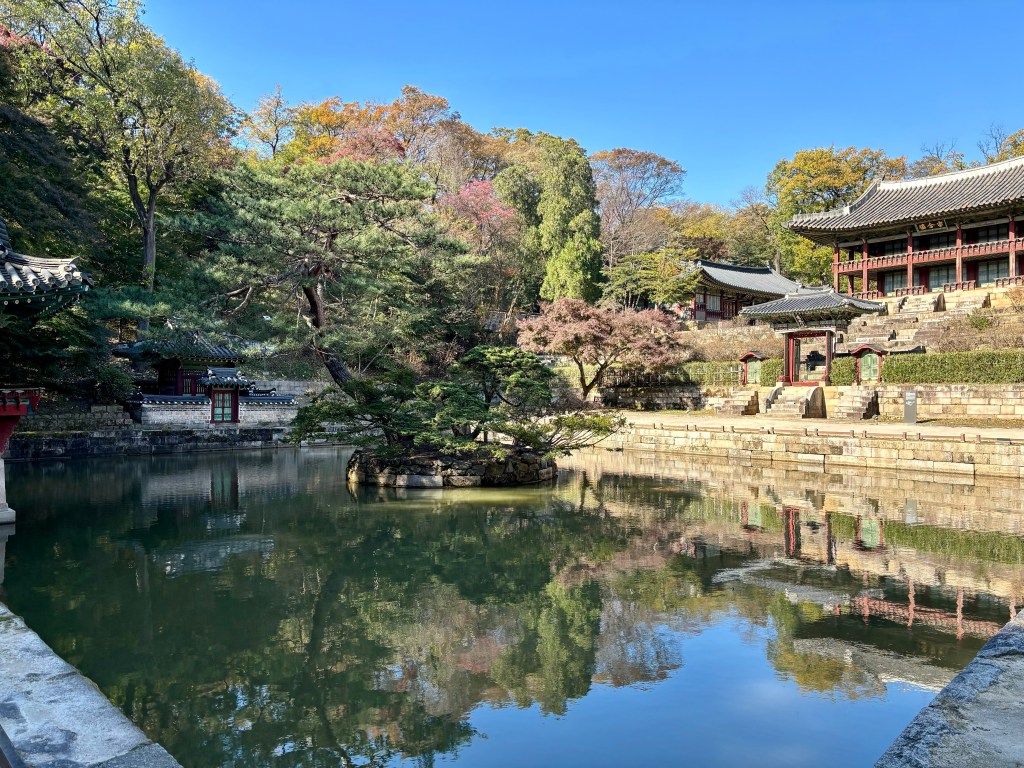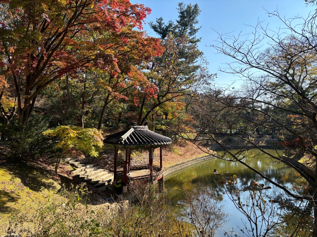 I quickly understood why Huwon, the secret garden, is so coveted a sight. It is not a Japanese garden, so there’s no one unifying view of it; rather, it’s made of many different zones within the natural valleys of the hills around Changdeokgung. There’s a gorgeous square pond with a round island in the middle, which our guide explained reflected the belief that the earth was square and the heavens were round. The stairs lead up to the Royal Library; like in the Temple of Literature in Hanoi, scholars would come to this library to take exams in front of the king.