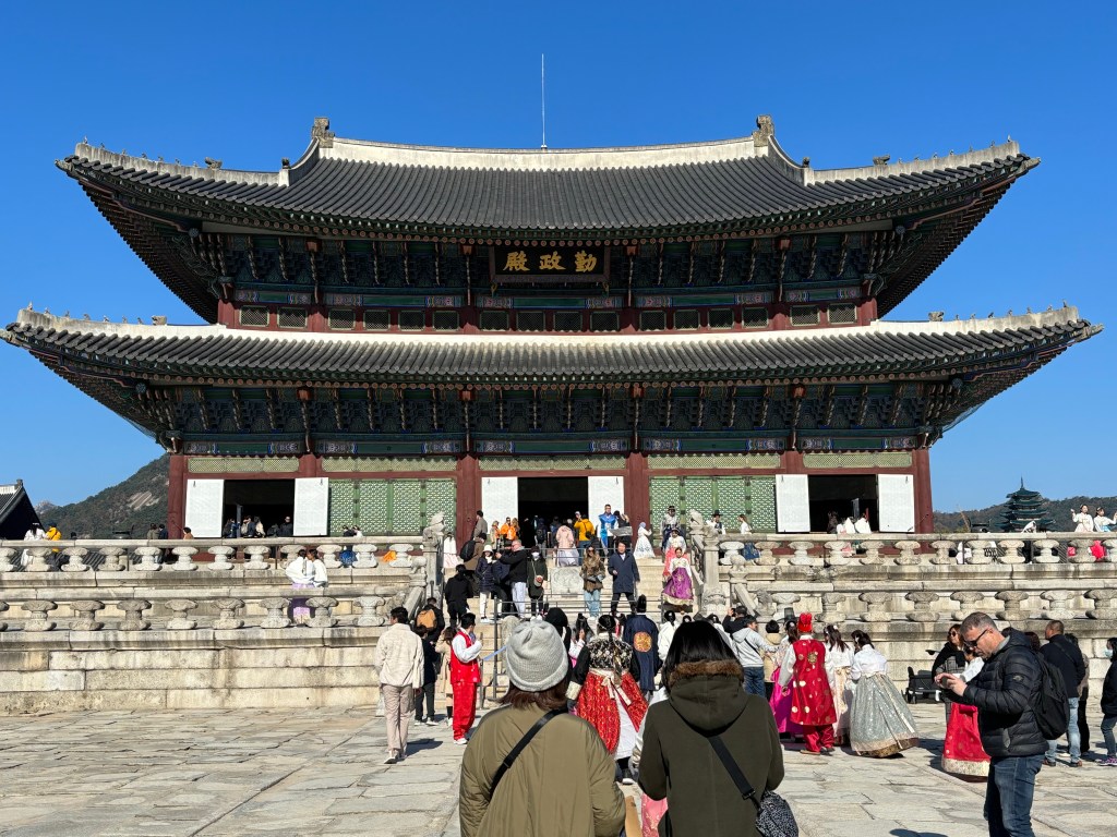 When I came out on the other side it was about noon, and I decided to push through and also visit Gyeongbokgung Palace, another royal palace across from Changdeokgung, with Bukchon in the middle. It was only after I’d bought the ticket and got a mal that I realized with a sinking feeling that the grounds of this palace looked enormous, with vast extensions of huge buildings on all sides. It was also way more crowded; whether because it’s more popular or because it was later in the day, I don’t know.