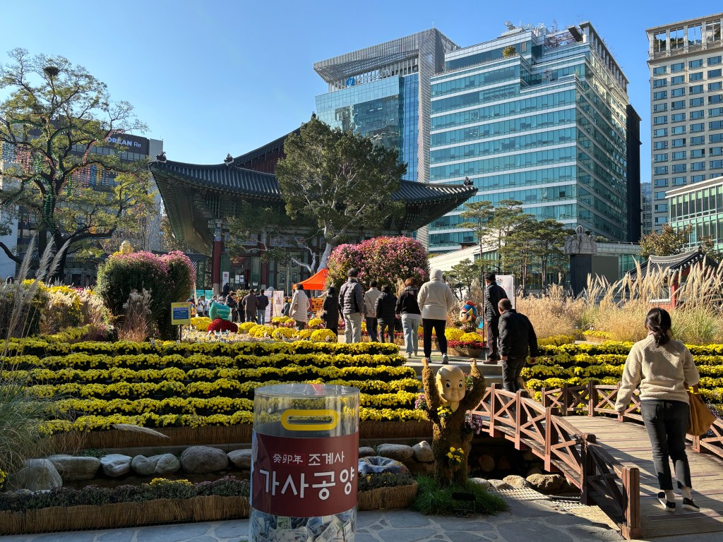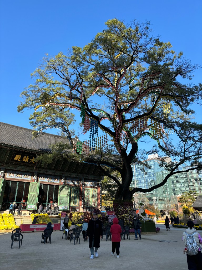 And then, because again it was right there, I also checked out Jogyess temple, the main Buddhist temple in Seoul. I hear sometimes it’s decorated with paper lanterns; today it was full of colorful flower arrangements, some in whimsical shapes. The temple itself was closed for a prayer service, but they played the priest’s chants to the outside as well, so I was able to enjoy the rhythmic sutras while I walked around the enclosure.