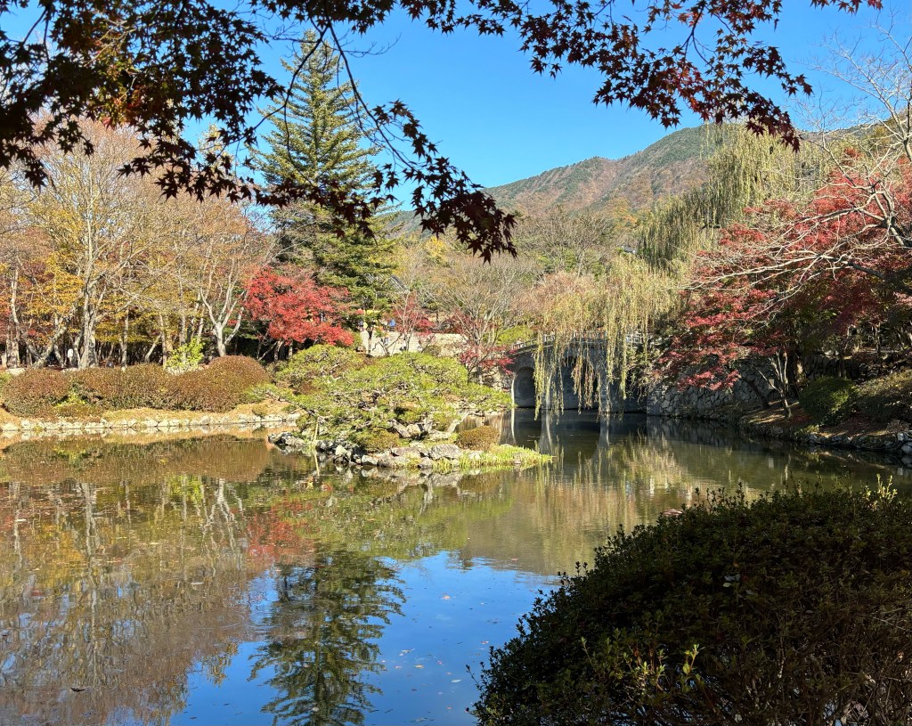 The walk from the road up the hill to the temple includes a gorgeous forested garden, yellowed and dry at the beginning but then giving way to a picture perfect pond with red maples, green willows gently flowing towards the water, and bonsai pine trees on a tiny island in the middle, all framed by a stone bridge. At 10°C, the sun shone warmly but the wind was cutting at times: nonetheless, it was a pleasure to take a moment to drink in the views.