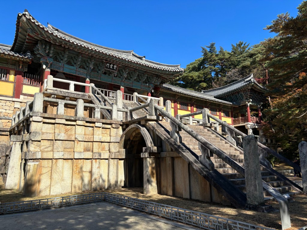 Like many Buddhist temples in Japan and elsewhere in Korea, Bulguksa was founded a long time ago (this one in 750, no less) and then destroyed and rebuilt many times over through history. The stone stairs and foundations are original, while some structures are from the 18th through to the 20th centuries.