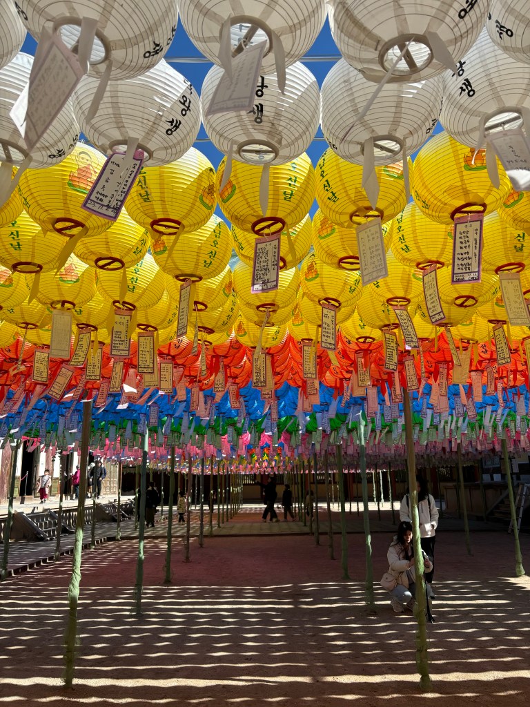 Inside I saw for the first time the array of paper lanterns that Korean temples lay out sometimes; I think the faithful write down their wishes and then tie them from the lanterns, together creating a charming, undulating effect when the wind blows through.