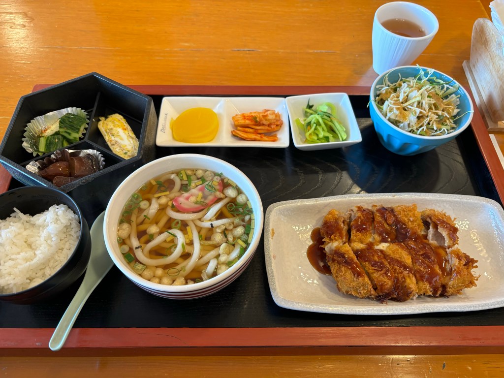 Eventually, I made my way back down the slope, to the road, and onto a bus back to Gyeongju. As packed as the temple was, the road was flanked by eerily empty amusement parks, convention centers and parks, to the point where I couldn’t tell if they were just empty or actually closed. I meant to stop at a restaurant called Sugyeong to eat, but either I missed my stop or the driver did, because when I got off I found myself in the middle of a market, with stalls selling vegetables on the sides of the streets. So instead, I went to Kisoya, a Korean-Japanese restaurant where I ordered a katsu set -which in Japan would include the katsu itself, rice, and miso- and was given a massive tray with all of that plus garnishes and even a bowl of udon out of nowhere. As I’m writing this, hours later, I am still full!