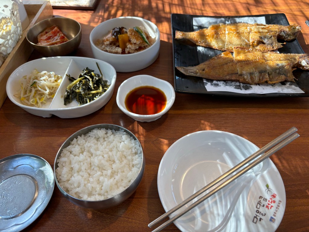 I went straight to a restaurant I’d preselected because I wanted to have dakgalbi, marinated chicken, but only when I sat down inside the traditional house next to the touristy street and was handed an English menu did I realize that I’d misread the Korean menu online: what I thought was dakgalbi (닭갈비) actually read deokgalbi (떡갈비), which is something like a burger? Anyway, that didn’t appeal, so I ordered grilled sole, which came out with its usual accoutrements: