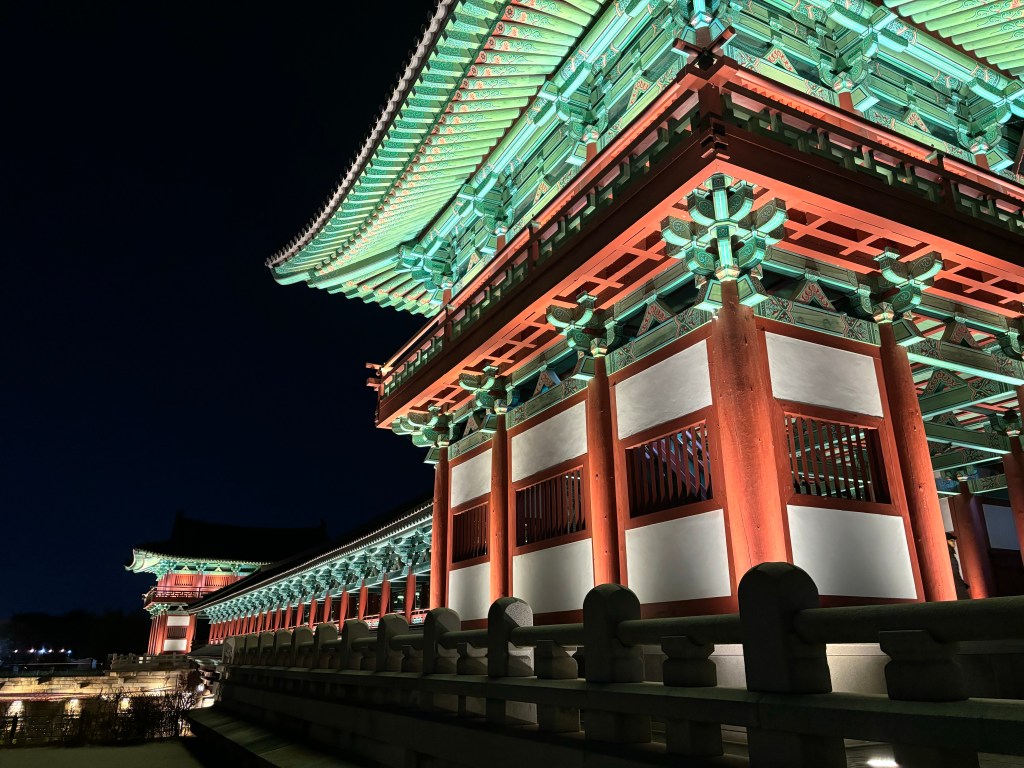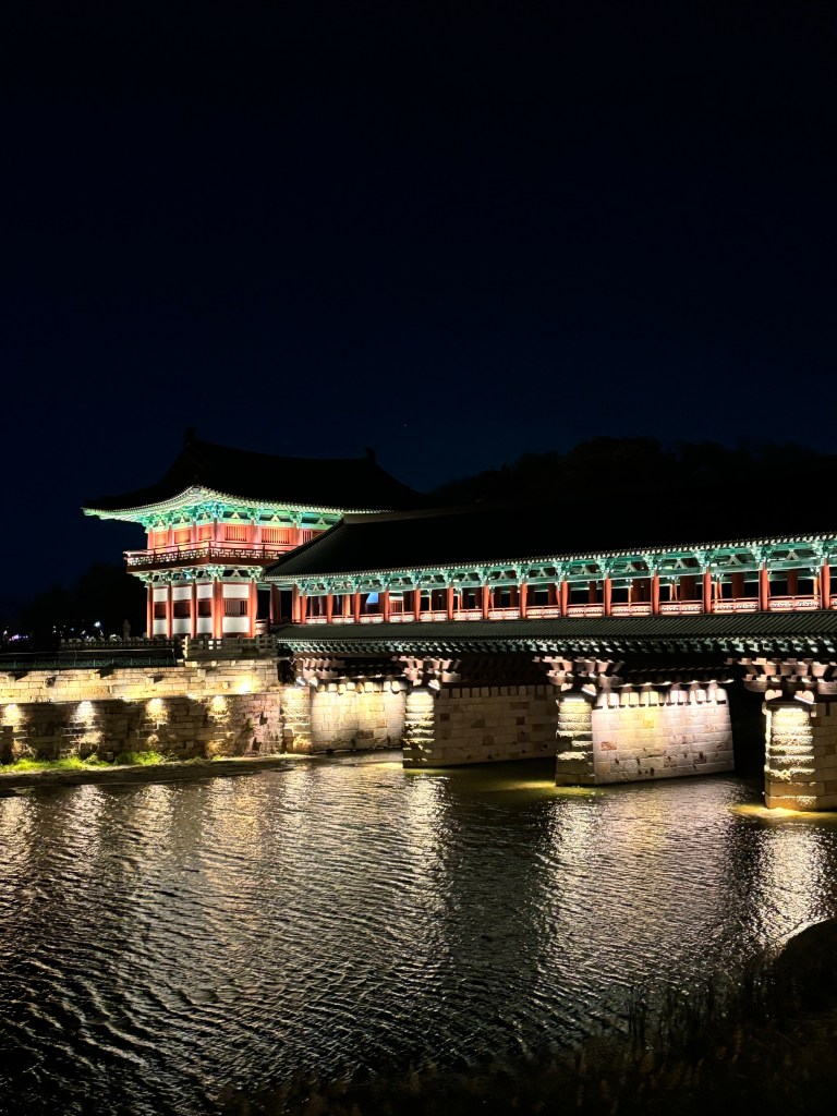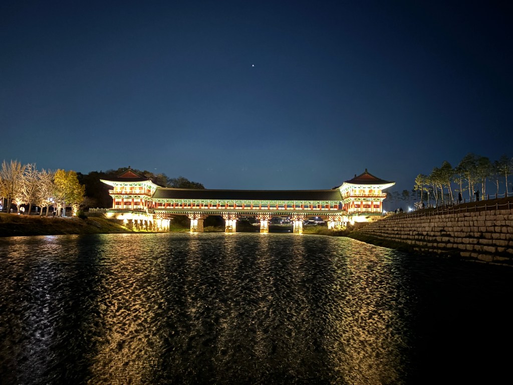 I took a quick look and a couple of pictures -the cold did not invite further reflection- and made the short walk across the park to my next (and primary) goal: Woljeonggyo bridge. Another one of Gyeongju’s famous sights, this traditional Korean bridge is impressive in its own right but becomes spectacular at night, when the lights showcase its vibrant colors and project its reflection onto the water.
