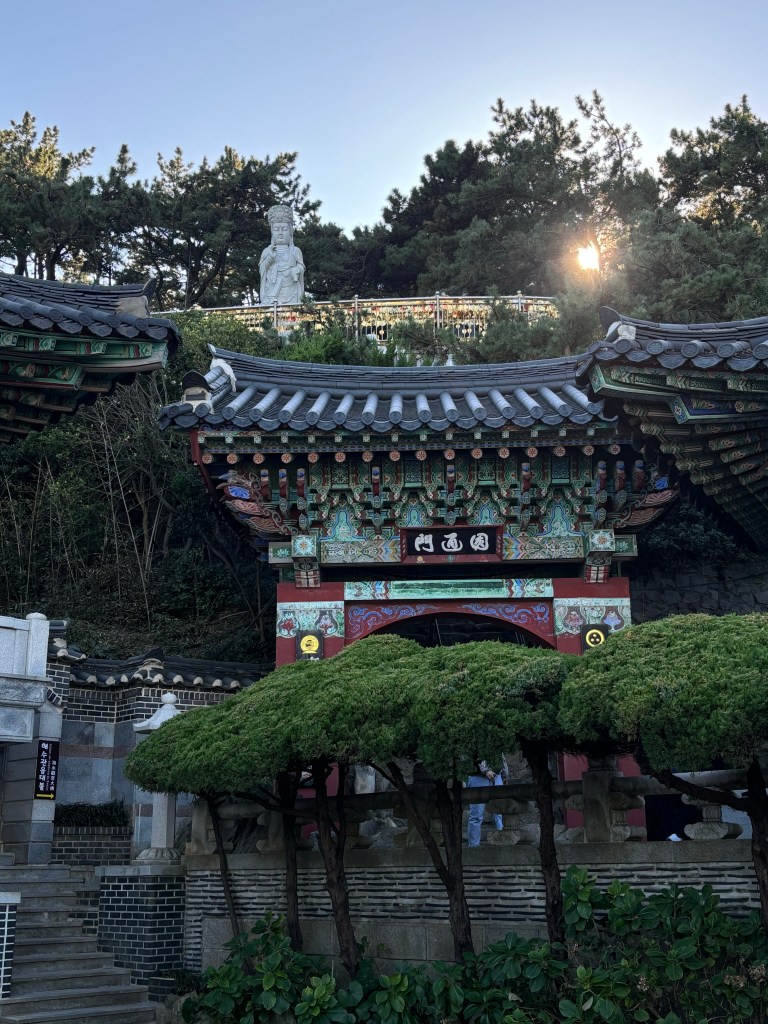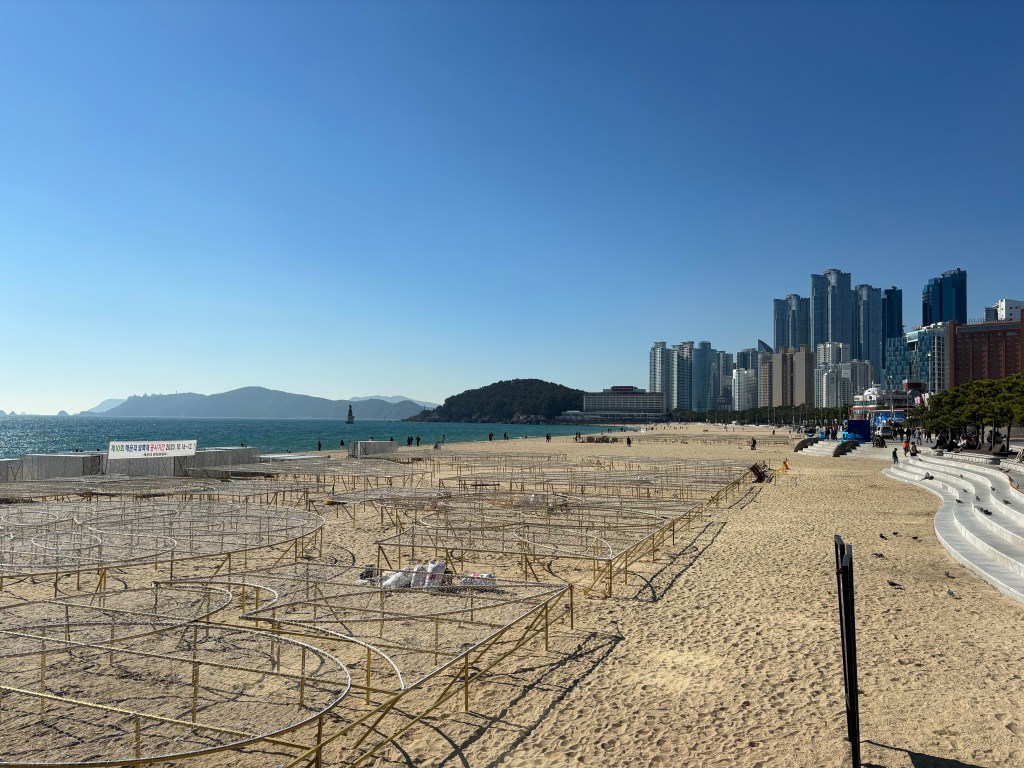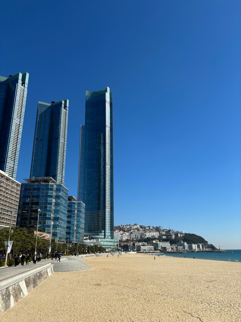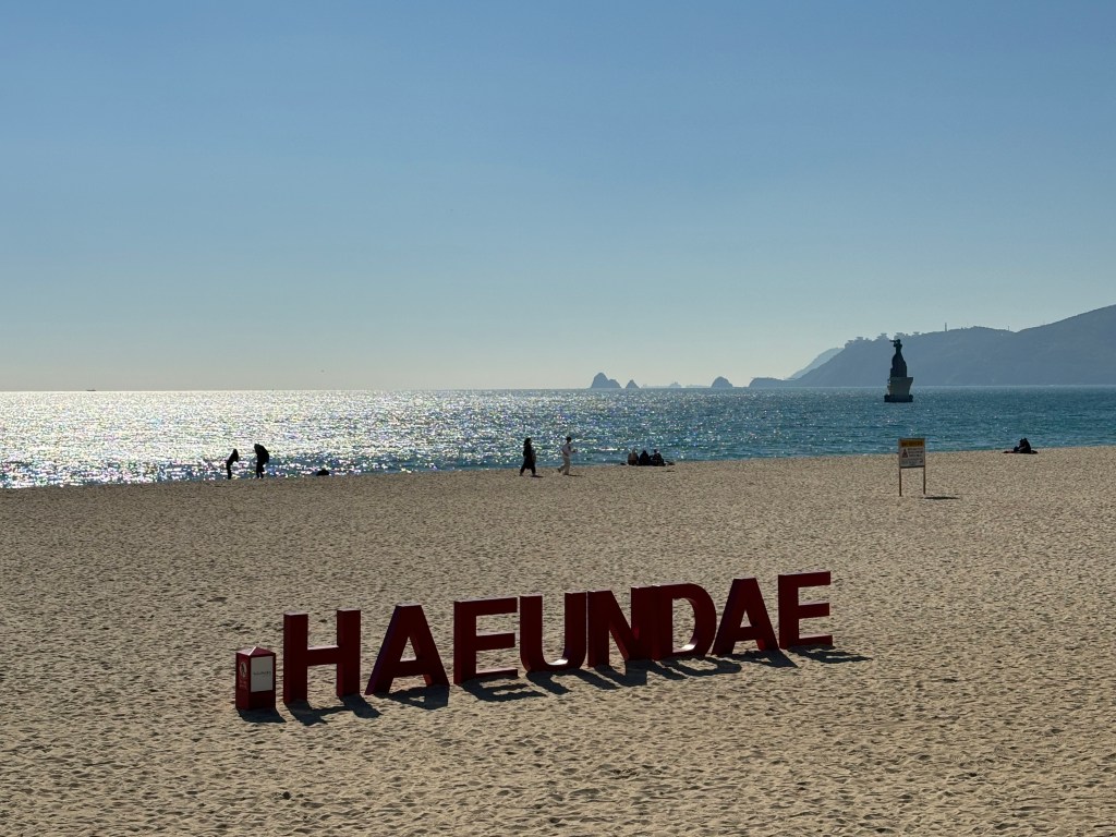 When I did eventually get started, I decided to go to Hadeong Yonggungsa, a 14th-century temple built right on the shore. It’s aaaaall the way to the west, so I first had to take a bus for like forty minutes to get to Haeundae, Busan’s most famous beach. Once there, I saw with dismay that my next bus wouldn’t depart for another twenty minutes, so I changed plans and took a look around Haeundae first.
