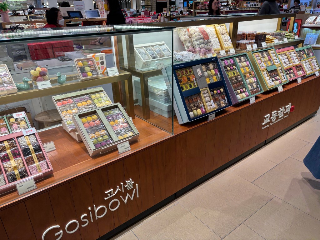 The only place I wanted to check out was the first basement, the food market. If you’ve been to Mitsukoshi in Tokyo (or if you’ve read about it on this blog!) then you already know what to expect: a vast expanse of food shops, selling every kind of food imaginable, for outrageous prices, in colorful packaging, ideal for gifts. There were shops for gimbap, macarons, waffles, biscuits, tea, fish cakes, seaweed, dried squid, Korean medicinal herbs, unidentified fried stuff on a stick, rice crackers, cakes, and I’m sure there was more than my brain can recall.