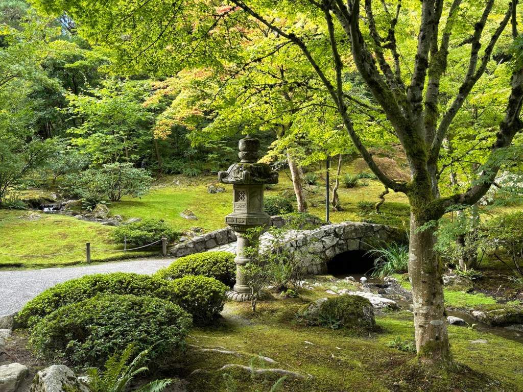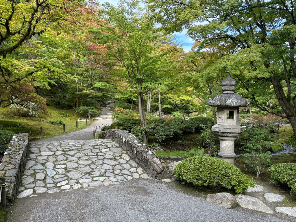 After paying a $10 ticket at the gate, our path into the garden immediately split in two, as it forms a loop around a small but immaculately landscaped pond. The trees haven’t yet turned, but when the sun shone down on the opposite side, we could see gold and orange colors among the sea of green.