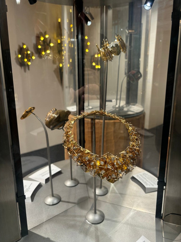 The thing that most impressed me about Bill Reid’s work was how multidisciplinary of a craftsman he was: he made paintings, sculptures, wood carving (including magnificent totem poles, which I have learned are used to trace family lineage or tell a story), calligraphy, and even jewelry. Look at this gorgeous gold and diamond necklace, designed to look like star constellations: