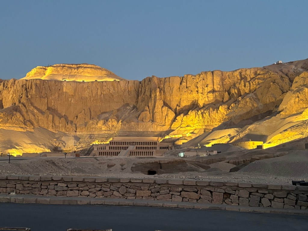 Our first stop, at the very crack of dawn, was the Temple of Hatshepsut; and I do mean the very crack of dawn, because when we got off the car it was dead at night, and by the time our guide had finished his introductory talk the sky was already blue, the sun threatening to climb over the jagged cliffs that bought us a few extra minutes of shade.