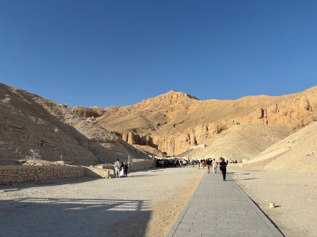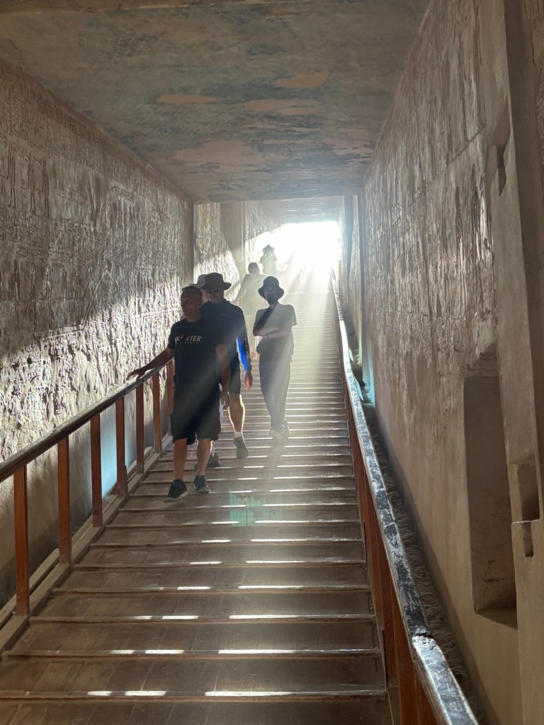 From here our next stop was the Valley of Kings, an archaeological site where many pharaohs excavated their tombs. It is not visually very meaningful on the ground level, because it’s just mounds of gravel and dirt everywhere, but underneath the tumuli lie deep passages with intricately carved walls.