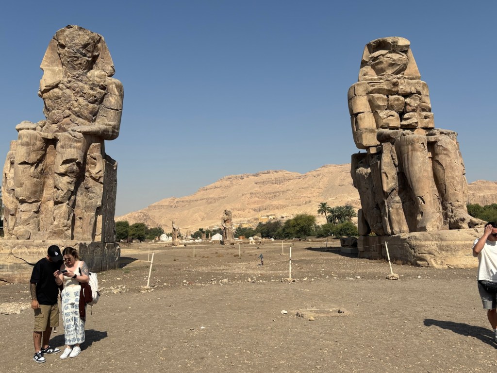 We made a stop at the Colossi of Memnon, which are historically significant (apparently they are carved out of a solid block of stone and they are the biggest standing statues in Egypt?) but as a tourist sight they are a bit of a letdown. The temple they used to guard is long gone and an earthquake caused so much damage that the statues are barely recognizable as such.