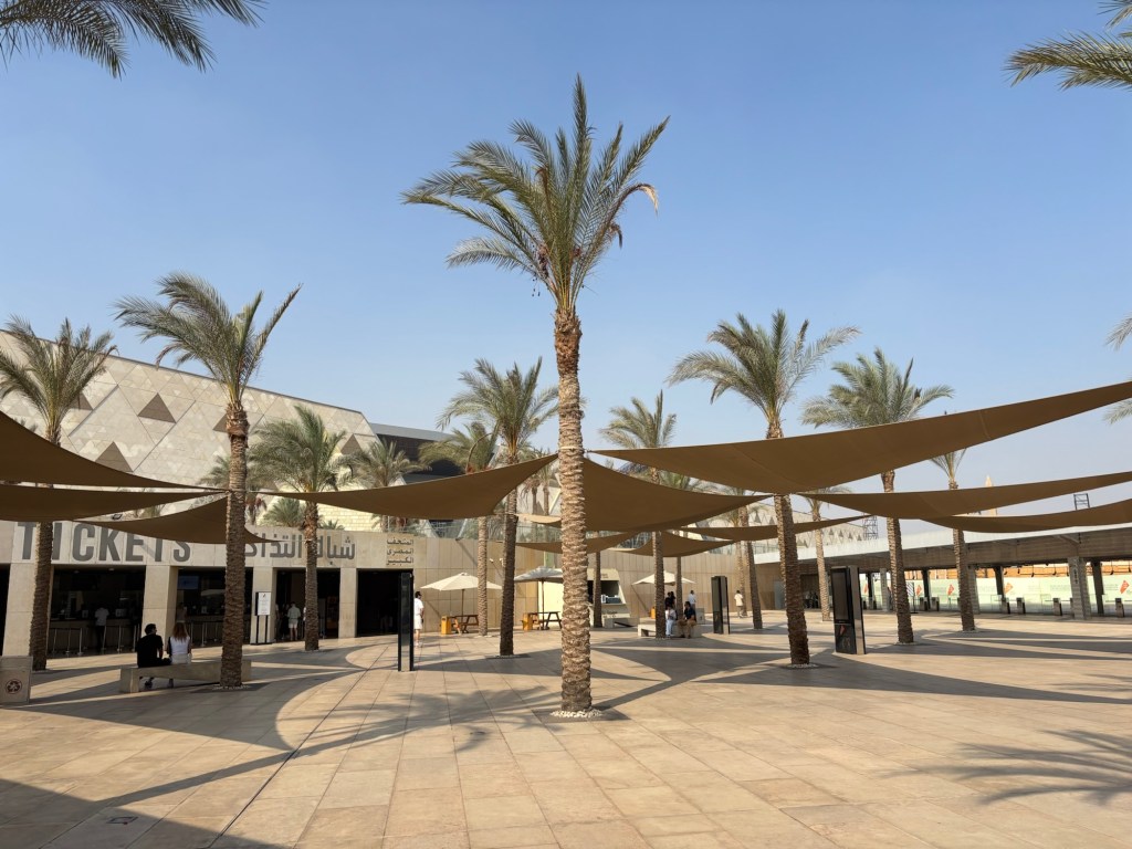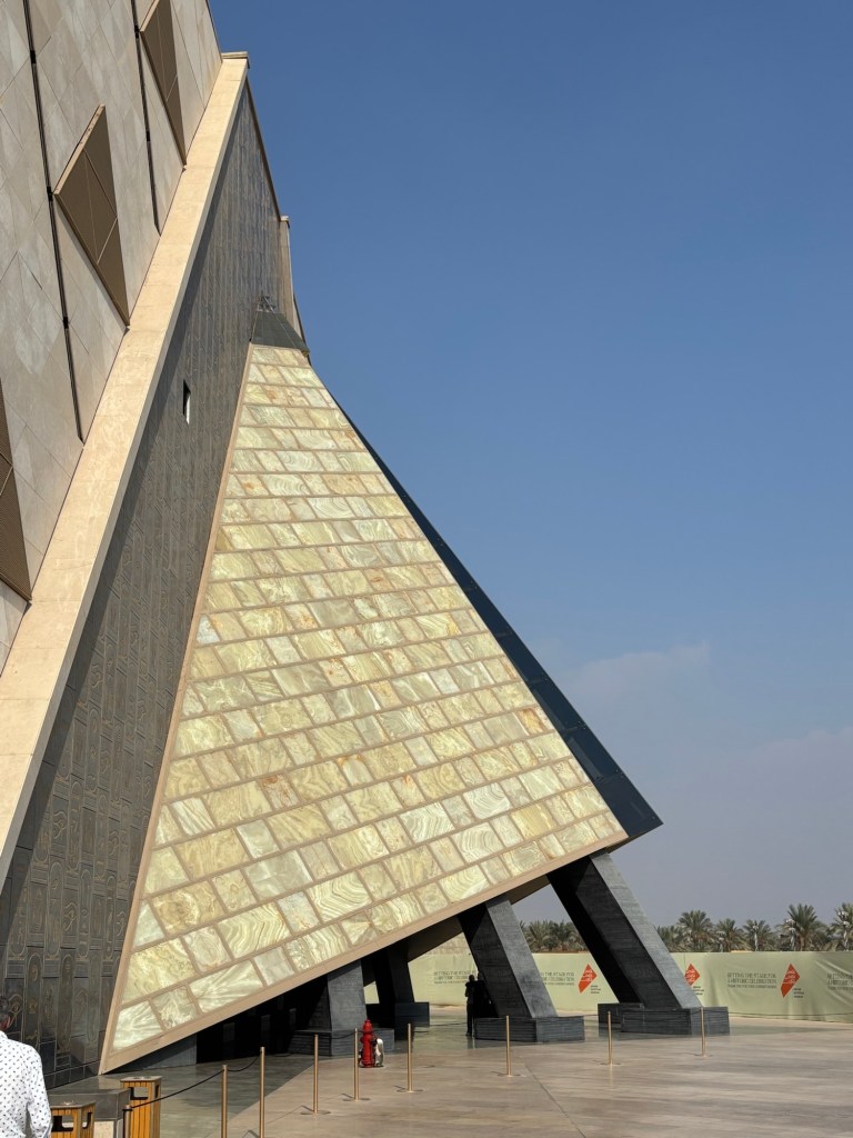 I arrived at a huge, diaphanous open-air space with ticket windows (I bought mine online, expensive for Cairo at around €20), drapes for shade, and palm trees, and some construction where the main plaza with a towering obelisk was still under construction (guys, there’s a deadline!). You don’t really see the building itself until you’re at the very door.