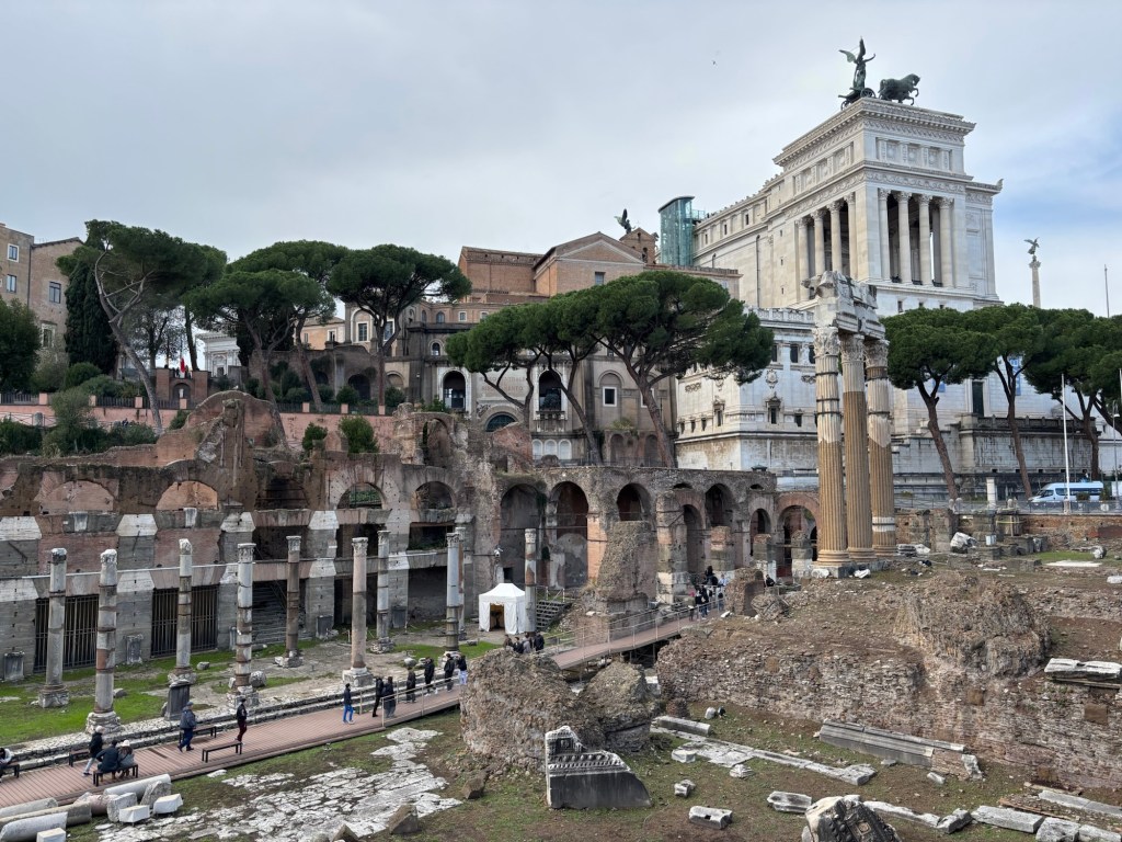 From the museum there was a great view of the Forum, a great expanse of ruins that manage to evoke how grandiose Rome must have looked during the Republic and the Empire. I walked down the hill towards the Forum, only to discover that this too has been closed off and requires a ticket to enter (same ticket as the Colosseum, apparently?) which once again is weird because you can walk all around the ruins from the outside and get a great view of every remnant in it, so I’m not sure my visit would have been improved by walking across the center. I guess that’s why they bundle it with other places!